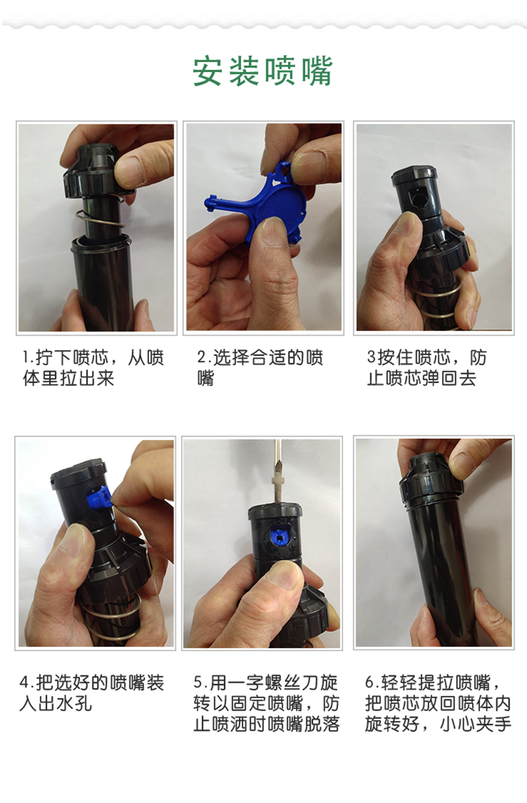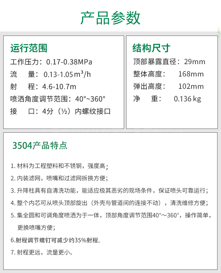 该系列喷头适用于公园、游乐场、校园、工矿企业、街道等中小面积草坪、花卉的灌溉。